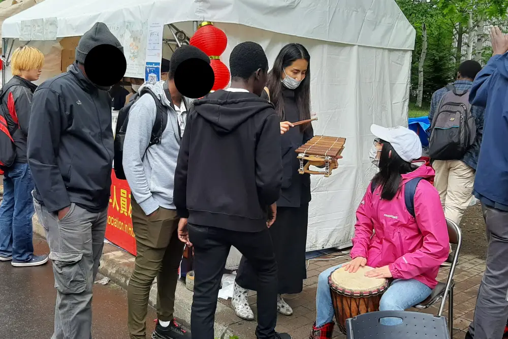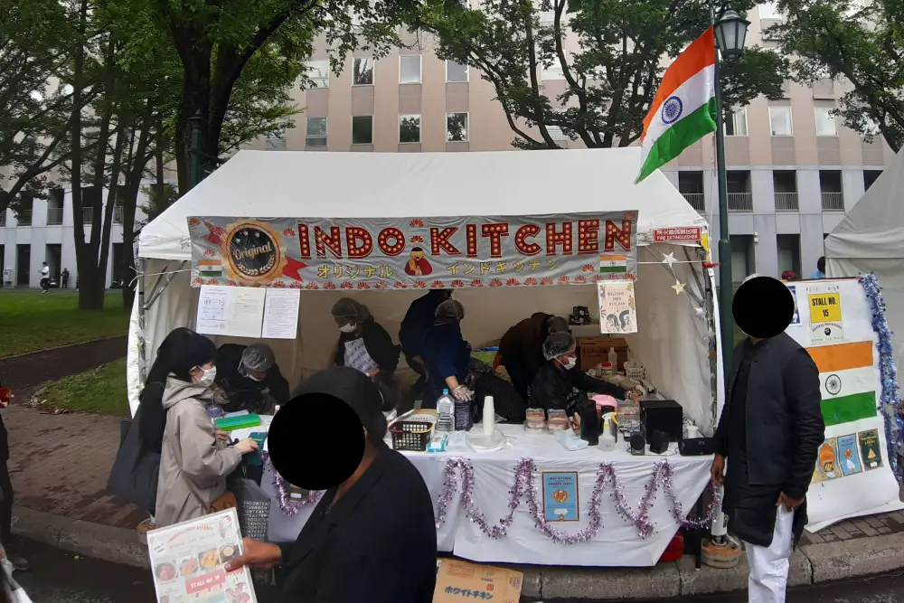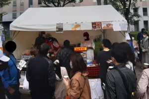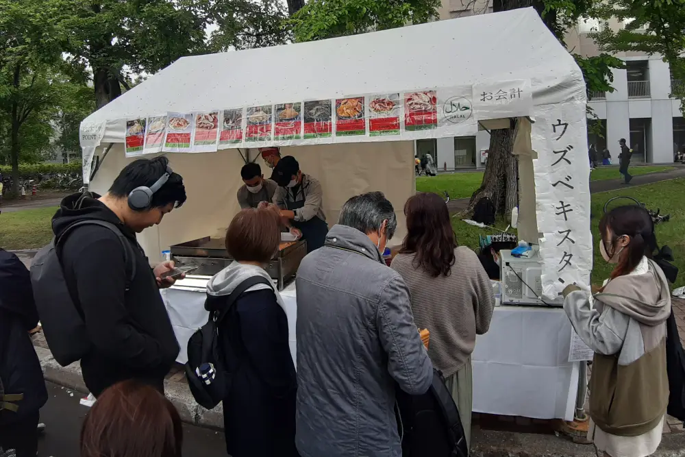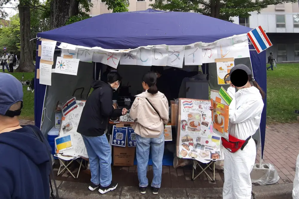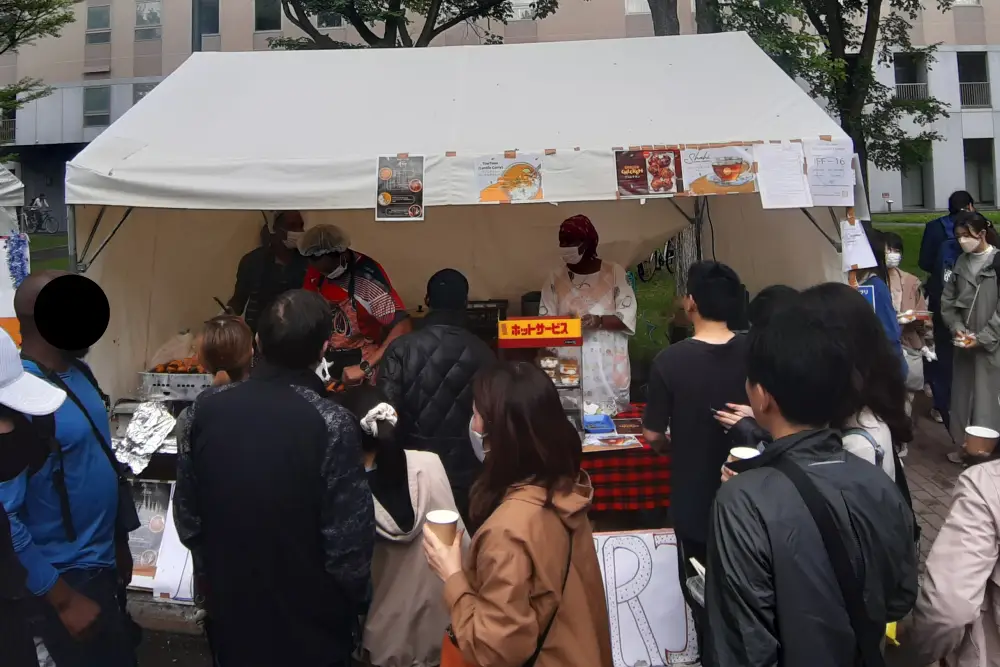 国際フードセクションは北大の南部にあり、ここでは、北海道大学の留学生が国籍に基づいてチームを組み、各国/地域固有の特別な料理をテントで作って販売していました。写真は参加国/地域名のアルファベット順に並んでいます。