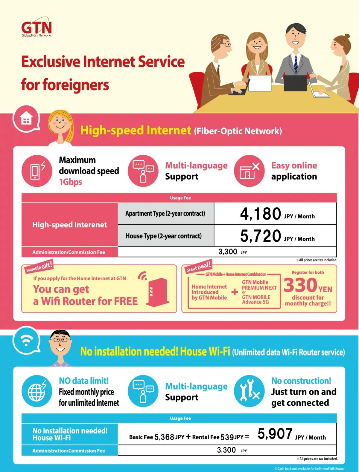 Applying for Japanese phone number can be inconvenient specially if you are foreigners. Since you may need to register your address first in local ward office. But with our partner, Global Trust Network (GTN), we can make your apartment application even easier, specially if you are still outside Japan! We provide both Japan phone number SIM Card that you may get the moment you arrive in Japan, as well as high-speed fiber optic internet with easy-to-apply procedure!