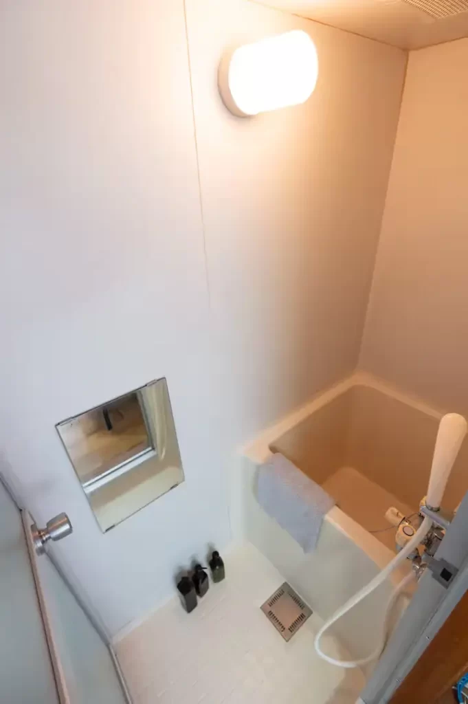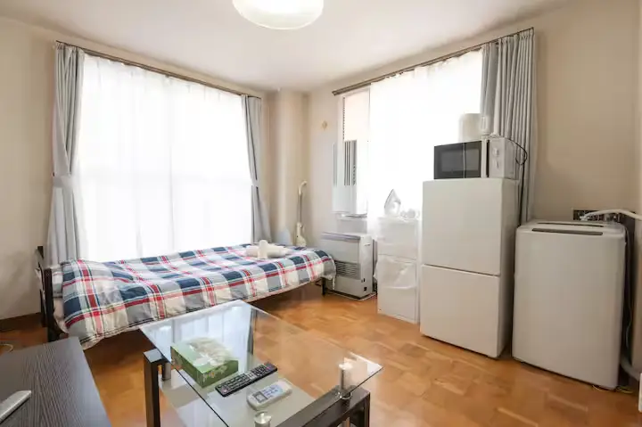 - Other Facilities: Single bed, refrigerator, washing machine, microwave, TV, kitchen, unit bath, free Wi-Fi, table, curtains, single burner IH stove, cooking utensils, Kettle, glasses, plates, cutlery, circulator, iron set, gas heating Various detergents, vacuum cleaner, first aid kit, shampoo, conditioner, body soap, umbrella