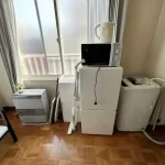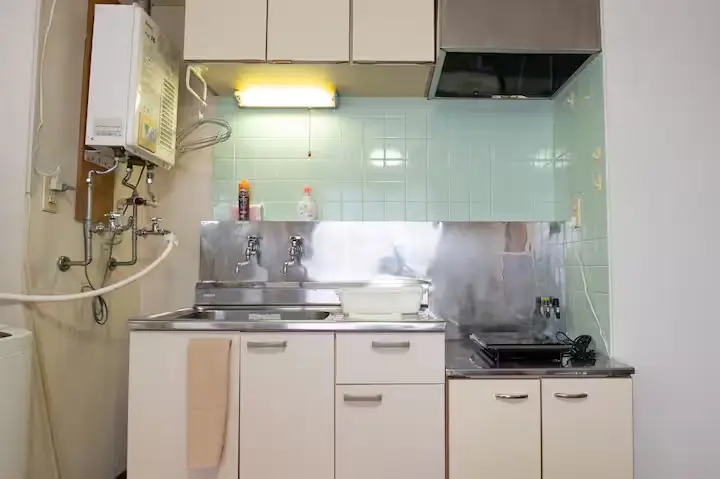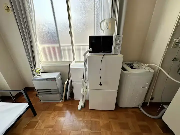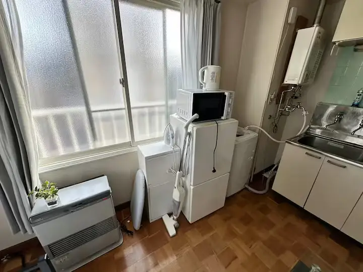 - What’s included: Single bed, refrigerator, washing machine, microwave, TV, kitchen, unit bath, free Wi-Fi, table, curtains, single burner IH stove, cooking utensils, Kettle, glasses, plates, cutlery, circulator, iron set, gas heating Various detergents, vacuum cleaner, first aid kit, shampoo, conditioner, body soap, umbrella