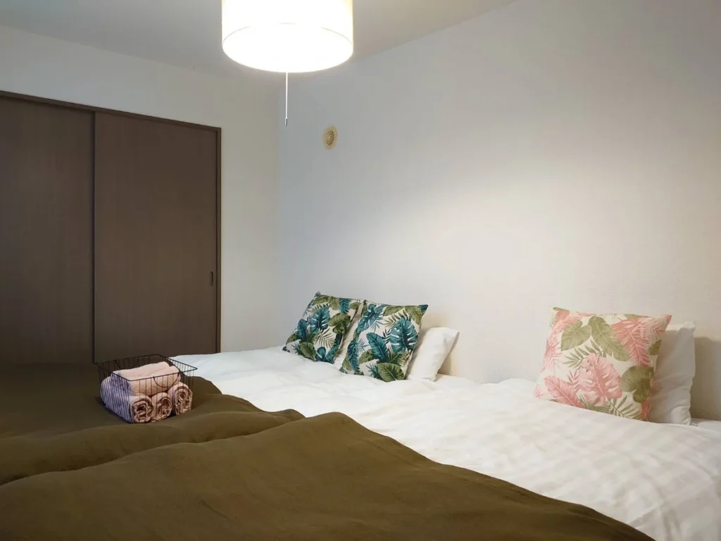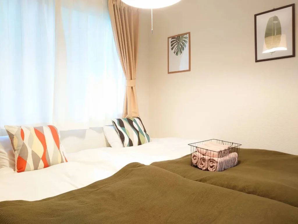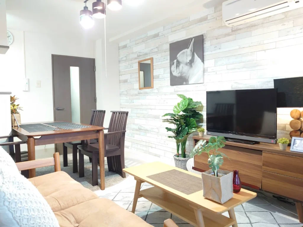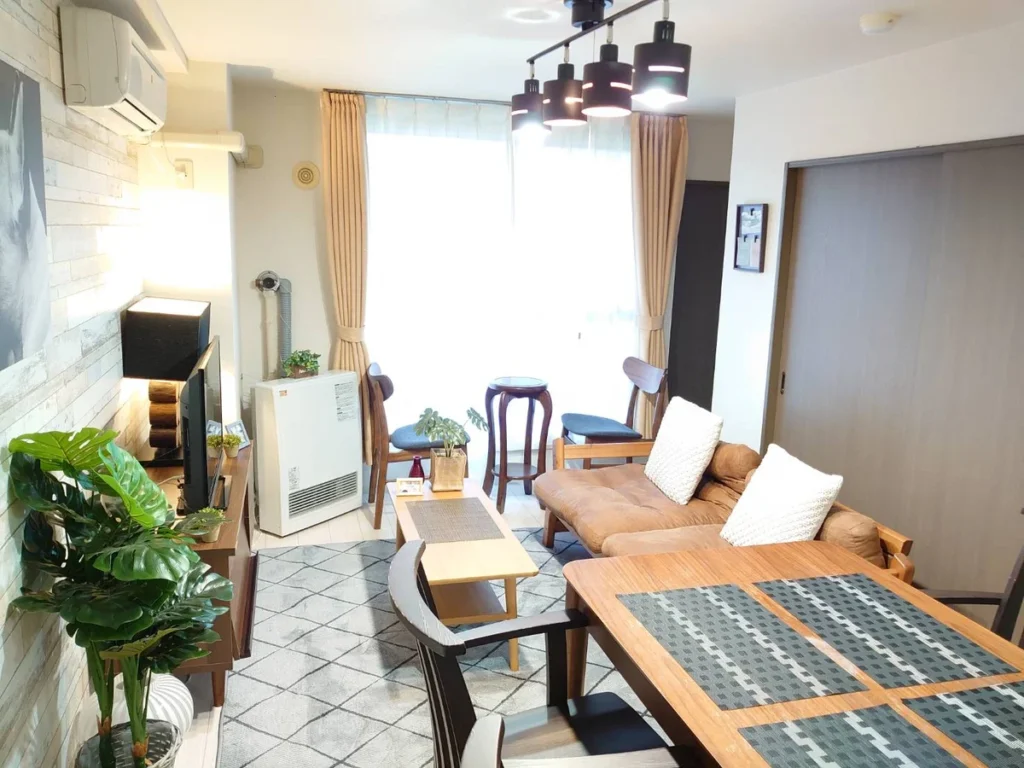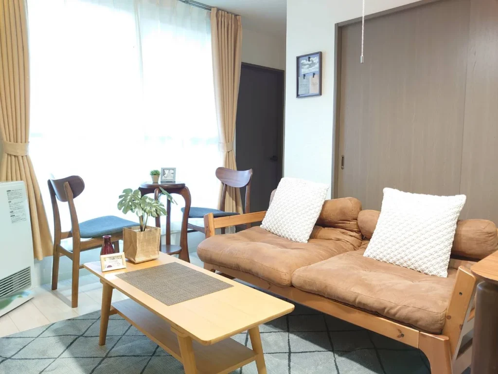 - What’s included: Appliances and furniture included, utensils, semi double bed x1, single bed x3, sofa x1, tea table x2, tea chairs x2, TV, dining table, 4 dining chairs, 2-burner IH stove, fan, AC, vacuum cleaner, rice cooker, kettle, fridge, washing machine, microwave, free internet.