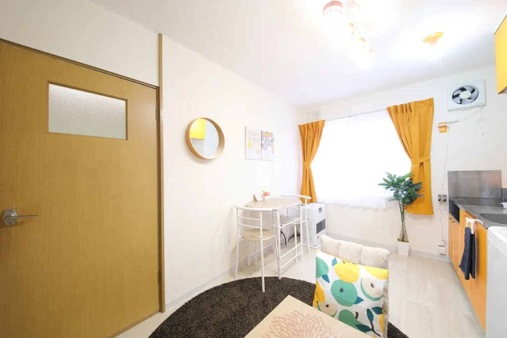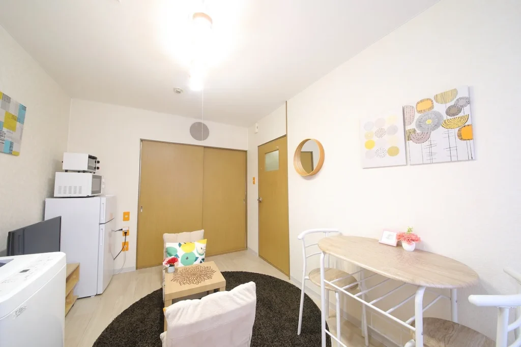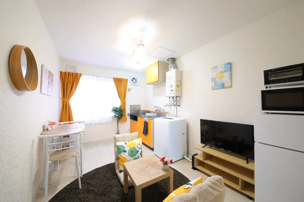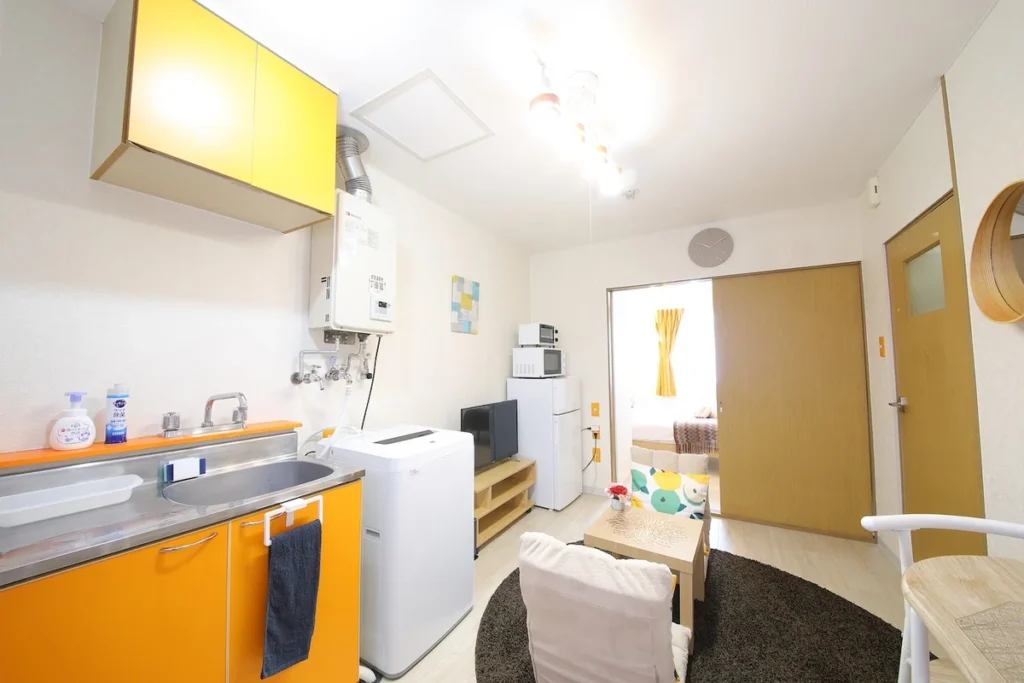 - What’s included: Appliances and furniture included, utensils, double bed x1, floor chair x2, tea table x1, TV, dining table, 2 dining chairs, 2-burner IH stove, fan, AC, vacuum cleaner, rice cooker, kettle, fridge, washing machine, microwave, free internet.