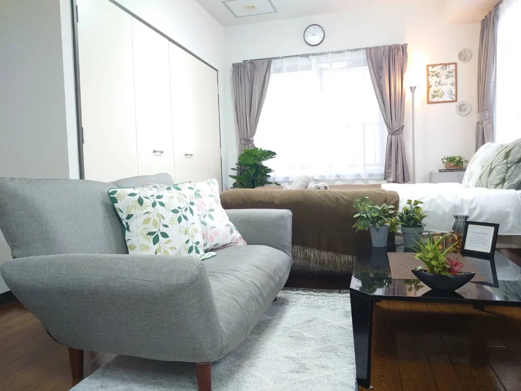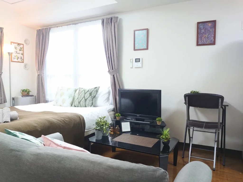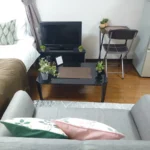 - What’s included: Appliances and furniture included, utensils,double bed x1, sofa x1, tea table, TV, dining table, 1 dining chair, 2-burner IH stove, fan, Portable AC, vacuum cleaner, rice cooker, kettle, fridge, washing machine, microwave, free internet.