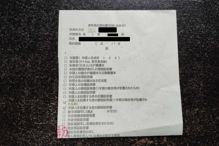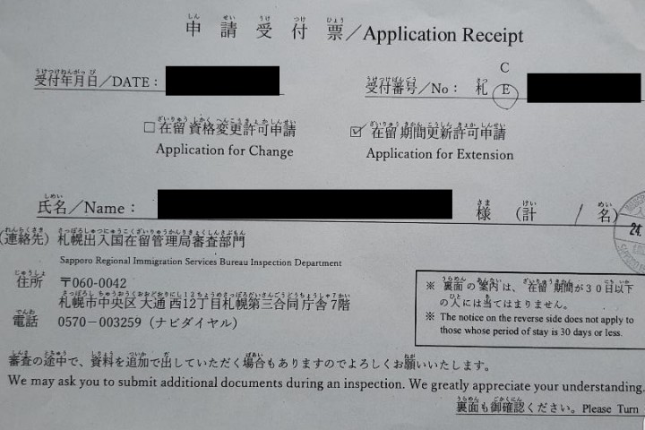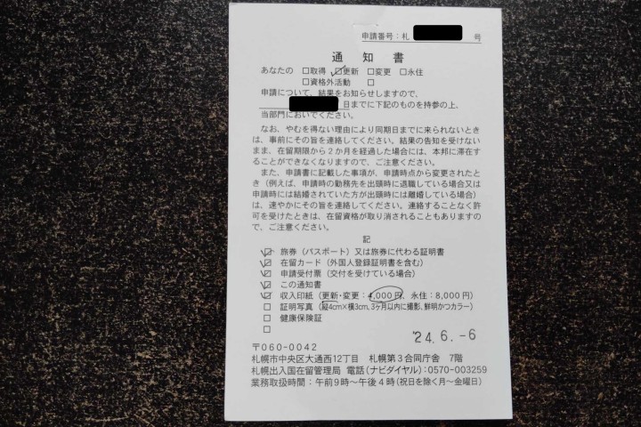 札幌签证延期、在留卡更新方法 如果您计划在日本停留更长时间,那么在签证到期前延长签证/居留卡非常重要。因为逾期逗留在日本是一种严重的罪行!强烈建议您在签证到期前 1 或 2 个月申请签证延期。如果您未能在签证到期前延长签证或至少向当局报告签证到期情况,您可能会面临刑事指控,并可能被无限期禁止进入日本!延长日本签证听起来可能很困难和复杂,特别是如果您不会说日语。但不要担心,只要您准备好所有必需的文件和信息,您的签证延期就会顺利!本文将特别介绍在札幌延长签证/居留卡的分步程序。注意:本指南基于管理员的个人经验(2024 年 5 月)。程序可能因您拥有/计划申请的签证类型而异。 返回住宿 1. 检查你的签证类型 检查你现在的居留卡,上面写着 STATUS,我的情况是 [配偶者] 或 [日本国民的子女或配偶]如果你想将你的签证更改为其他类型,请务必参考札幌入国管理局官方网站上的文件。https://www.moj.go.jp/isa/applications/status/index.html (Japanese)https://www.moj.go.jp/isa/applications/status/?hl=en (English) 2. 准备好所有必要的文件和材料 确保为您想要的签证类型准备一份。对于此文件,它是用于延长当前的配偶签证。转到上面列出的链接选择[Japanese Spouse] → [If the foreigner national (applicant) is a Japanese spouse (husband or wife)] → [Application form for extension of period of stay]选择正确的签证类型和服务类型后,您将被引导到您需要准备的所有文件/材料的指南。确保事先准备好所有必要的文件!提示:强烈建议在前往移民局之前填写所有必要的表格以节省时间! 3. 前往札幌入国管理局 入国管理局位于西十一丁目站(东西线)附近. location通过大堂安检后直接前往大楼 7 楼。 进入办公室后,领取排队号码并等待。当叫到您的名字时,前往柜台并出示所有文件和已填妥的表格。 如果您需要提交其他文件,您将收到一张附有其他文件清单的单据以及一个用于邮寄的特殊信封。您可以通过邮件发送这些附加文件(无需再次前往办公室)。就我而言,是税务文件(用于配偶签证延期)。 您还将收到一张带有编号的申请收据,以便领取您的更新居留卡(请勿丢失此单)。 4. 根据要求通过邮件发送所有其他文件(如果有)。 5. 等到收到入境管理局的通知单后,就可以领取更新的居留卡了。 通常需要 1-2 周的时间才能收到移民局的通知单。请务必携带所有必要的文件来领取您的续签居留卡!就我而言:护照旧居留卡步骤(3)的申请收据通知单准备一些现金来购买印花税票(我的情况是更新印花税票花了 4000 日元). 6. 再次前往札幌入国管理局领取新的在留卡. 返回移民办公室后,直接前往位于大楼地下室(B1)的便利店购买印花税。 拿到印花税后,直接前往大楼七楼,直接拿排队号,等候排队。 轮到您时,将所有必要的文件和材料交给负责的官员。您将被要求在柜台填写另一份表格。这时您需要印花税票;您需要将印花税票贴在表格上。等待几分钟后,您将获得续签的居留卡。延期期限各不相同,但就我而言,我获得了 3 年的延期。